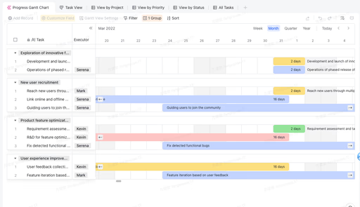 Trong quá trình triển khai, Gantt Chart cho phép cập nhật trạng thái từng nhiệm vụ, từ đó dễ dàng so sánh tiến độ thực tế với kế hoạch ban đầu. Người quản lý có thể nhanh chóng nhận diện các nhiệm vụ bị trễ hạn, điều chỉnh lịch trình hoặc phân bổ lại nguồn lực để đảm bảo dự án không bị gián đoạn.
