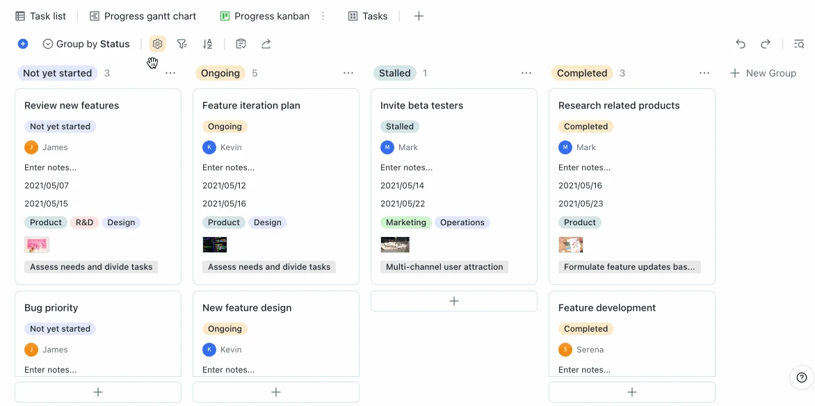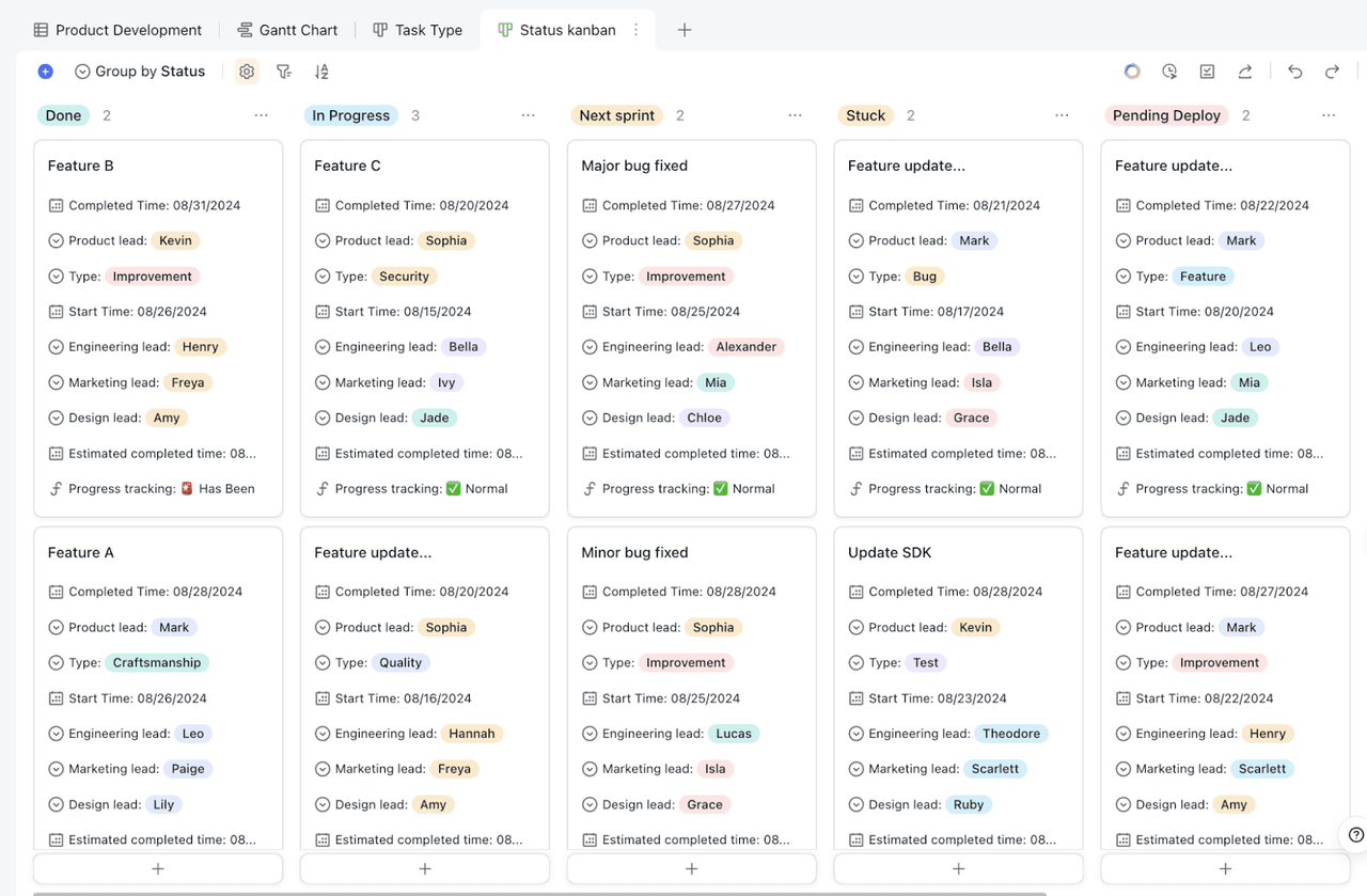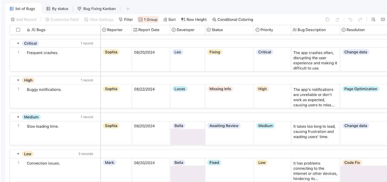 Lark Base cho phép người dùng nhóm nhiệm vụ theo nhà phát triển, mức độ ưu tiên hoặc mức độ nghiêm trọng của lỗi, tùy thuộc vào những gì phù hợp với nhu cầu của đội bạn