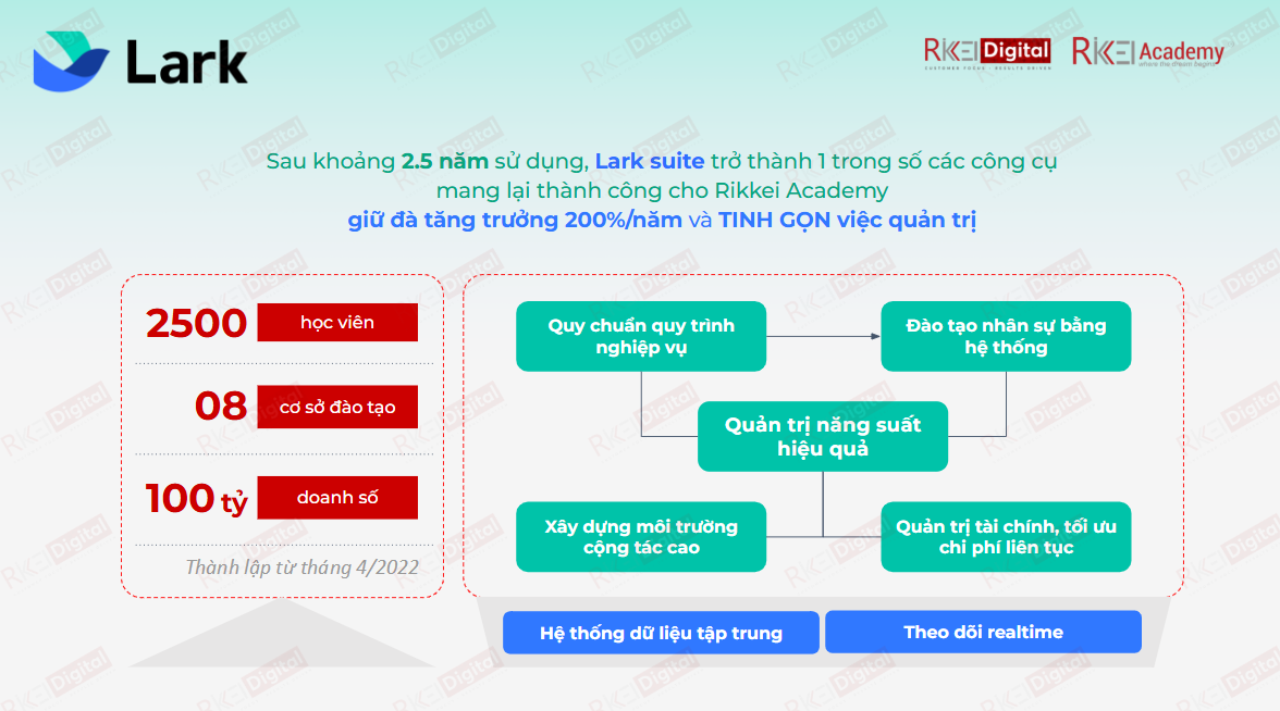 Lark Suite được đánh giá là công cụ chiến lược và yếu tố cốt lõi, đóng vai trò quan trọng trong sự tăng trưởng vượt bậc của Rikkei Academy trong hơn 2 năm đầu gia nhập thị trường. Nền tảng này đã được khai thác triệt để, tích hợp toàn diện vào mọi khía cạnh quản trị, quản lý và vận hành, mang lại hiệu quả ấn tượng.