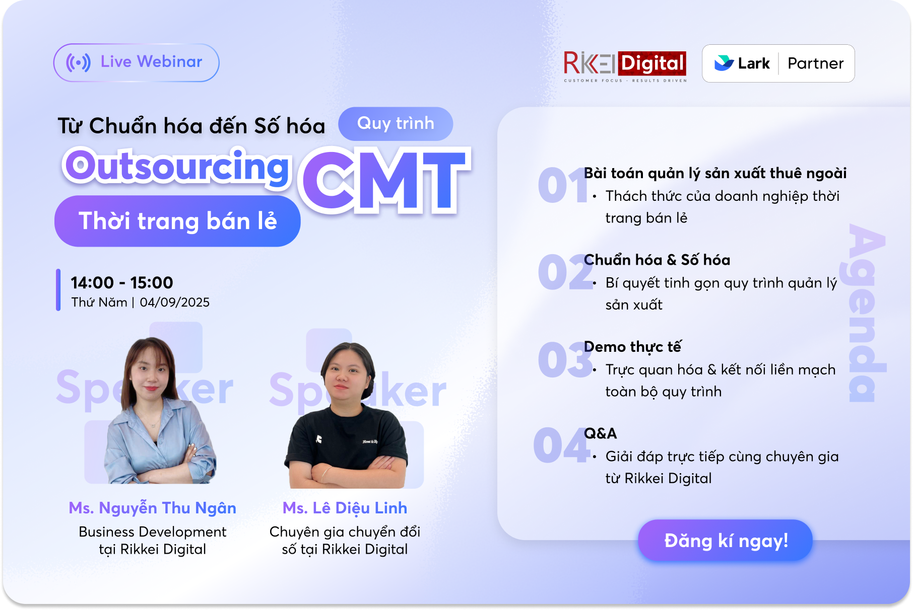 Nhằm giúp doanh nghiệp khắc phục những thách thức này, Rikkei Digital tổ chức Webinar với chủ đề "Từ Chuẩn hóa đến Số hoá quy trình Outsourcing CMT ngành thời trang bán lẻ". Sự kiện sẽ chia sẻ cách chuẩn hóa và số hóa toàn bộ quy trình sản xuất, giúp doanh nghiệp nâng cao khả năng kiểm soát, rút ngắn thời gian đưa sản phẩm ra thị trường và vận hành hiệu quả, tinh gọn hơn.