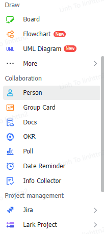 Trong Lark Docs, người dùng có thể gắn tag một cá nhân hoặc một nhóm có liên quan vào trong tài liệu. Ngoài ra, bạn có thể nhúng trực tiếp các công cụ khác của Lark vào Lark Docs như Poll, OKR, Reminder, Lark Project, Lark Sheets, Lark Base,... để quản lý và tập trung thông tin trên một trang duy nhất.