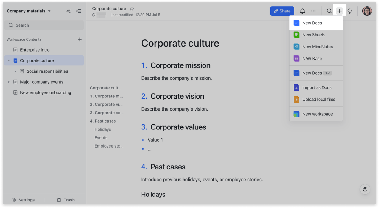 Phương pháp 2: Nhập không gian làm việc và nhấp vào + ở phía trên bên phải. Sau đó, chọn New Docs, New Sheets, New MindNotes hoặc New Base và chọn vị trí đích để tạo trang mới.