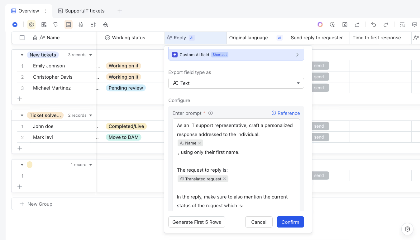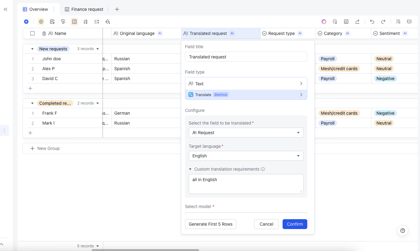 Dịch phản hồi dễ dàng Một trong những tính năng nổi bật của Lark Base là khả năng loại bỏ rào cản ngôn ngữ bằng cách tự động dịch phản hồi của người dùng từ bất kỳ ngôn ngữ nào sang ngôn ngữ mẹ đẻ của người sử dụng hệ thống.