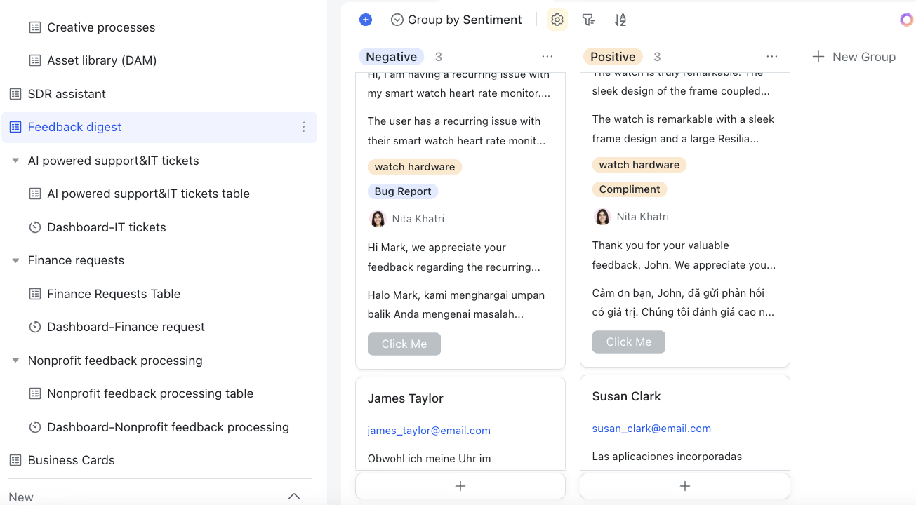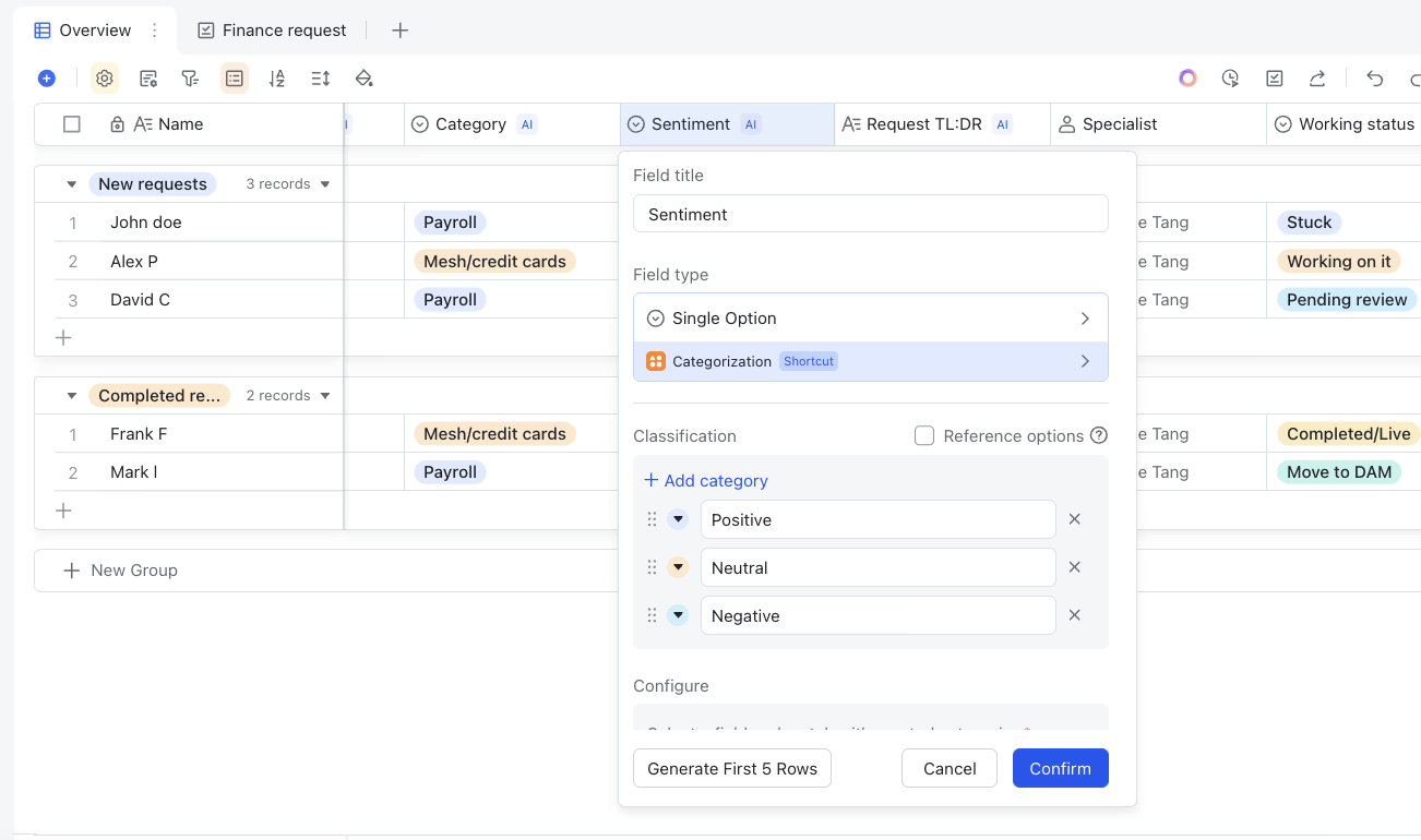 Lark Base có khả năng nhận diện cảm xúc trong phản hồi và tự động phân loại tích cực hoặc tiêu cực. Nhờ đó, đội ngũ có thể ưu tiên xử lý các phản hồi tiêu cực kịp thời để quản lý quan hệ khách hàng hiệu quả hơn. Việc giải quyết nhanh các vấn đề giúp hạn chế trải nghiệm xấu và biến tình huống tiêu cực thành cơ hội củng cố niềm tin của khách hàng vào doanh nghiệp.